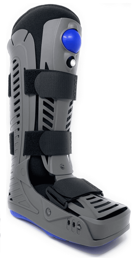 The High Top Aero Walker is a hard shell walker with plastic uprights that offer stability and support. If you were treating an ankle or rear foot injury, a low-top air walker would not be an ideal choice. You should use a high top walker if you are using wedges with the walker. It has an inflatable pneumatic air bladder that compresses the ankle when inflated. Turn the dial 1/4 turn counterclockwise underneath the blue ball to release the air pressure. Occasionally, you need to squeeze the air bladder after turning the dial.